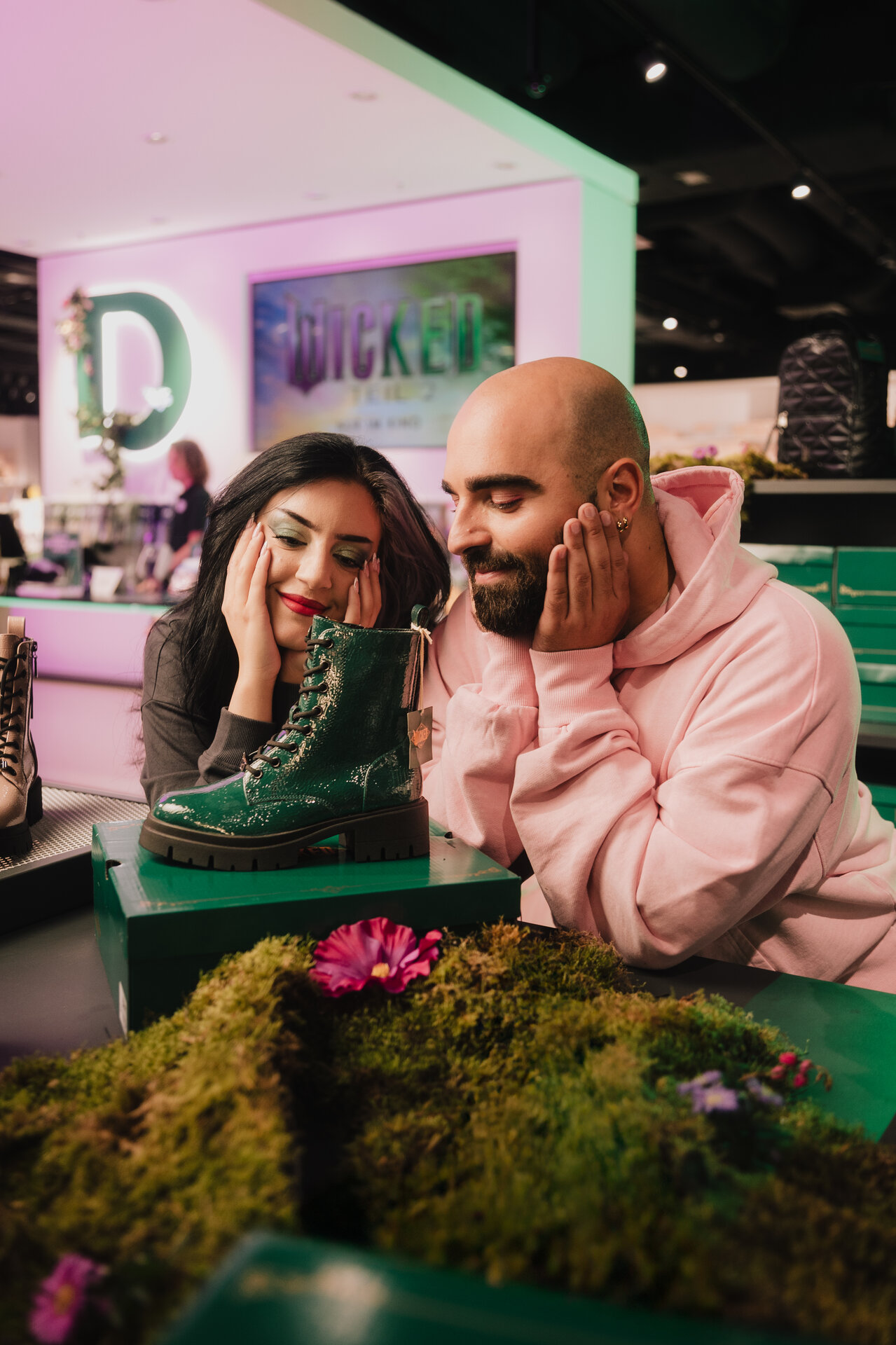 Magical moments in Berlin: yesterday evening, more than 180 guests experienced the international launch of DEICHMANN’s exclusive Wicked: For Good collection. Media representatives, VIP guests and content creators such as Samuel Dohmen, Stella Stegmann und Xhem were taken into the world of the witches of Oz, Glinda and Elphaba. The event was held in a historic brick building, bathed in pink and emerald green light to create a magical atmosphere. At the heart of the venue stood an impressive cherry blossom tree, with transparent balls inspired by Glinda’s bubble hanging from its branches and displaying highlights from the collection. Guests could personalize Wicked: For Good pieces and craft friendship bracelets in the DIY area, while the piercing station offered jewelry as a bold statement of solidarity or personal style.