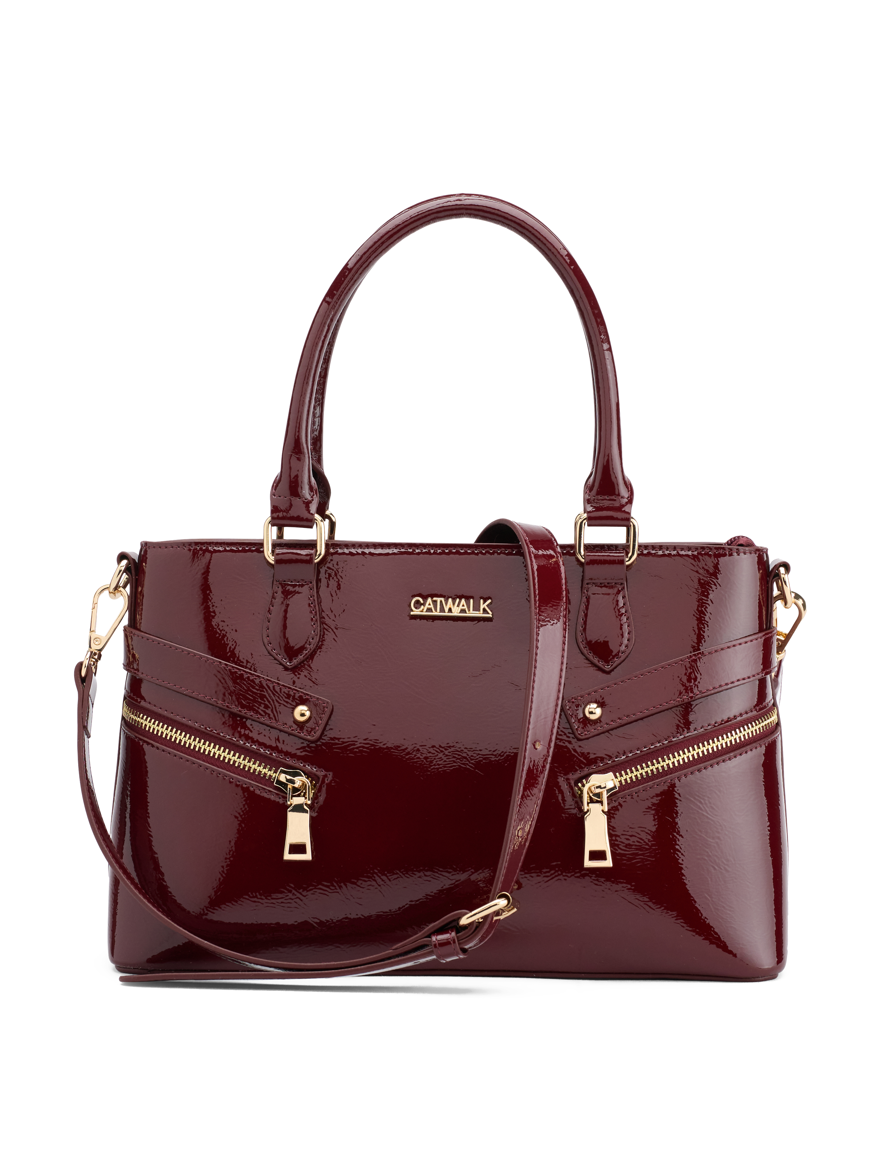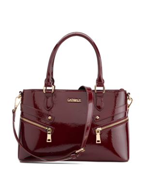 Daywear raffinato: la borsa burgundy effetto vernice dona carattere a un completo in lana o a un trench fluido in tonalità neutre.