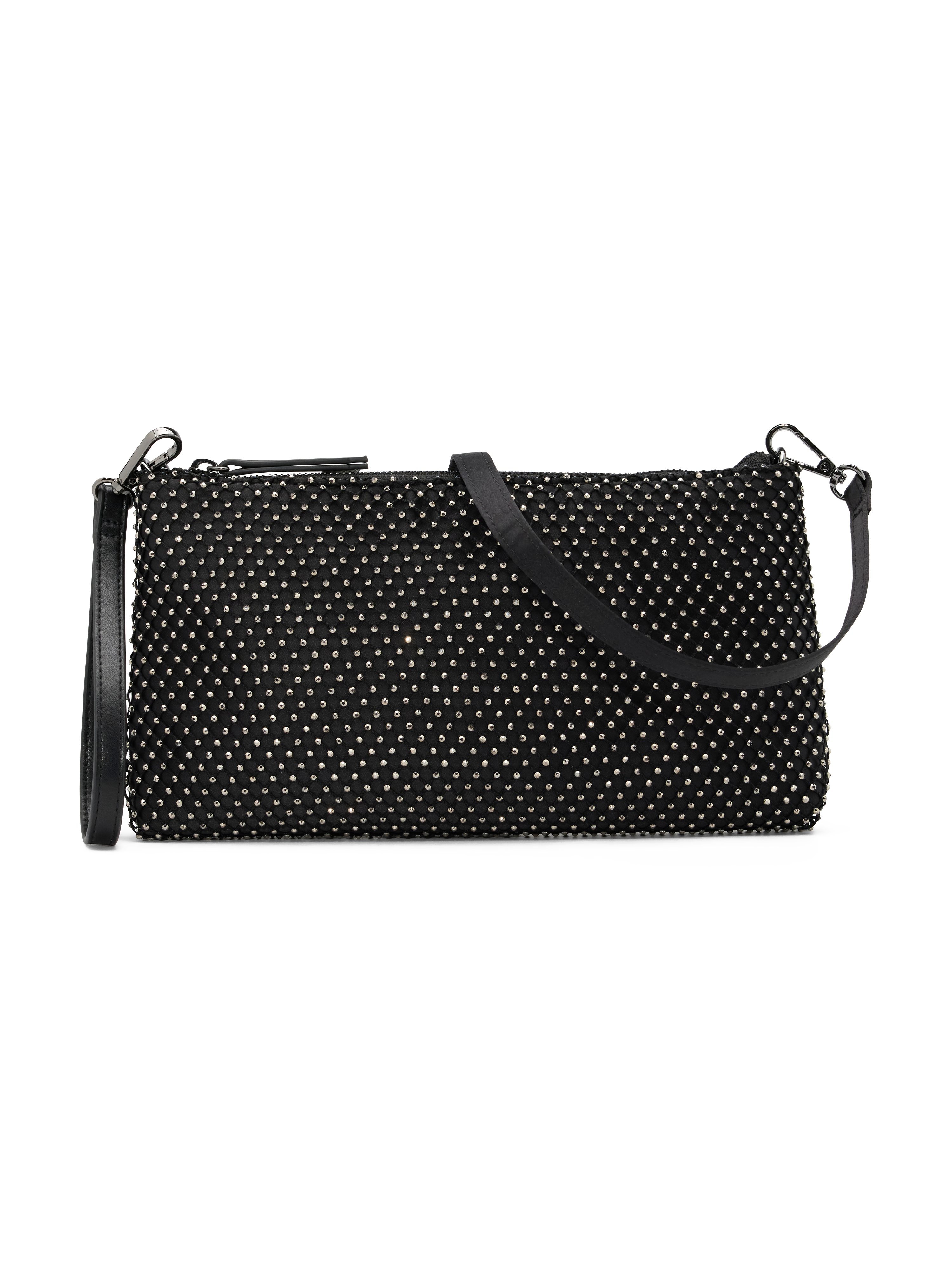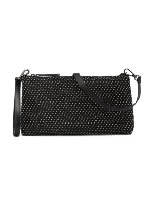 Glam da sera: le clutch e le baguette con micro cristalli illuminano abiti in velluto scuri e completi blazer-pantalone total black.